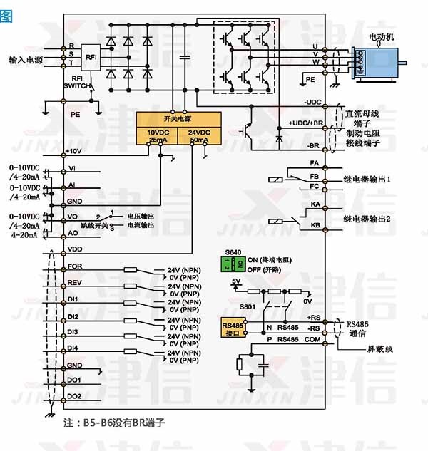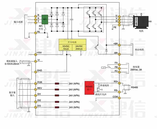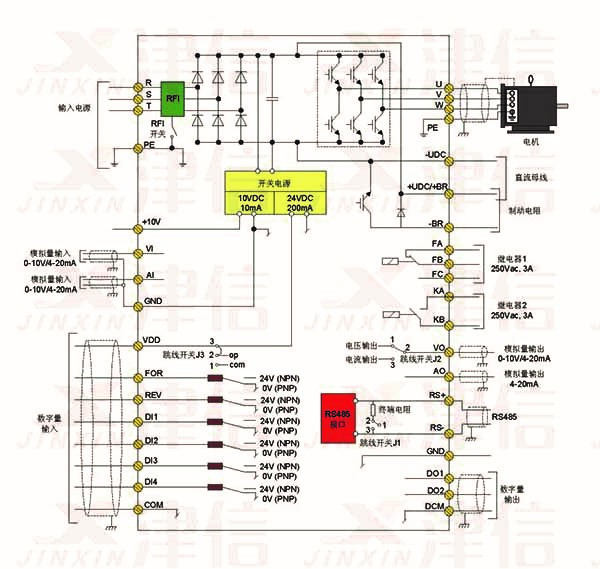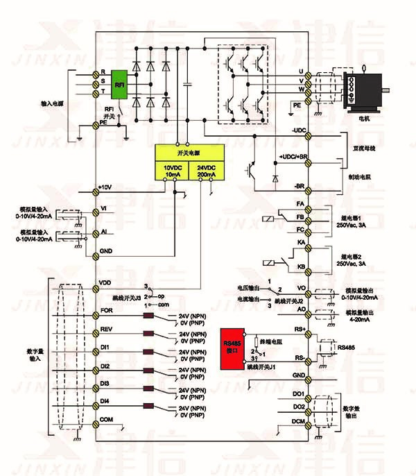 海利普變頻器主要由整流、濾波、逆變、驅(qū)動單元、制動單元、檢測單元微處理單元等組成。采用交-直-交工作原理,首先將三相交流電經(jīng)整流模塊變換成直流,再進行濾波后,通過IGBT等其它電力電子器件逆變成頻率和電壓均可變的三相交流電供電機使用。同時,通過IGBT的開斷調(diào)整輸出電源的頻率和電壓,從而達到調(diào)速、節(jié)能的作用。以下是海利普各系列變頻器的接線示意圖。
