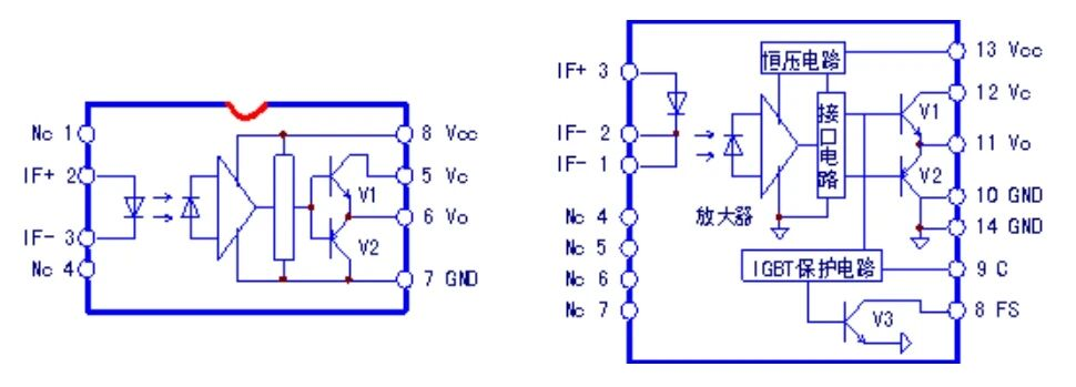 PC923是8腳封裝的光耦芯片,一般用于上三橋IGBT的驅動。PC929則為16腳封裝,用于驅動下三橋IGBT,因為PC929帶有IGBT保護電路和OC信號輸出電路,下三橋IGBT發射極Vce共用直流母線的負極,更方便于檢測IGBT導通管壓降,從而實現過流保護和輸出報警信號的任務。