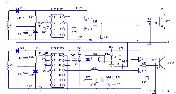 PC923光耦,由CPU主板來的脈沖信號經R66加到3腳,在輸入信號低電平期間,PC923形成由+5V,2、3腳內部發光二極管、信號源電路到地的輸入電流通路,PC923內部輸出電路的V1三極管導通,6腳輸出高電平信號(18V峰值),經R65為驅動后置放大電路的Q10提供正向偏流,Q10的導通將正供電電壓經柵極電阻R91引入到IGBT的G極,IGBT開通;在輸入信號的高電平期間,PC923的3腳也為+5V高電平,因而無輸入電流通路,PC923內部輸出電路的V2三極管導通,6腳轉為負壓輸出(10V峰值),也經R65為驅動后置放大電路的Q11提供了正向偏流,Q11的導通將供電的負10V電壓——IGBT的截止電壓經柵極電阻R91引入到IGBT的G極,IGBT關斷。在待機狀態,PC923的3腳輸入信號一直維持在+5V高電平狀態,則驅動電路一直輸出-10V的截止電壓,加到CN1觸發端子上,IGBT一直維持于可靠的截止狀態上。