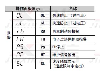 三菱變頻器報警信息包括OL失速防止 (過電流) , oL失速防止 (過電壓), RB再生制動預(yù)報警,TH電子過熱保護(hù)預(yù)報警 PSPU停止,MT維護(hù)信號輸出,SL速度限位顯示