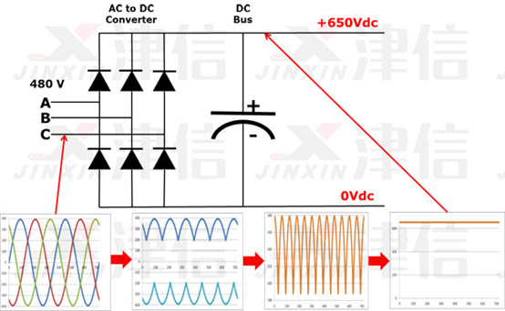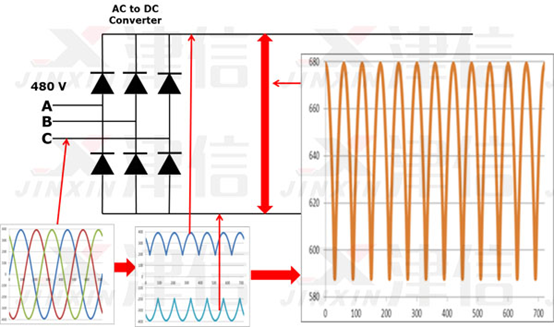 我們假設驅動器在480V電源系統上運行。480V等級為均方根。480V系統的峰值為679V。如您所見,變頻器直流總線具有帶交流紋波的直流電壓。電壓在大約580V和680V之間。