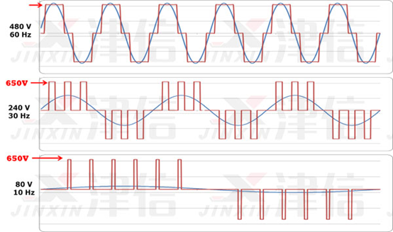 這稱為脈沖寬度調制或PWM。想象一下,我們可以通過高速打開和關閉閥門來控制水管中的壓力。雖然這對于管道系統來說不實用,但它對變頻器來說效果很好。請注意,在前半個周期中,電壓開和關的時間各占一半。因此,平均電壓是480V或240V的一半。通過脈沖輸出,我們可以在變頻器的輸出上實現任何平均電壓。