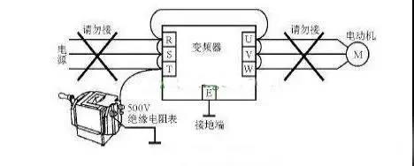 2、通用變頻器不宜做耐壓實(shí)驗(yàn)及絕緣電阻實(shí)驗(yàn)。做時(shí)應(yīng)當(dāng)使用500V絕緣電阻表測(cè)量,盡可能減少搖測(cè)次數(shù)。絕緣前應(yīng)斷開(kāi)全部的外接主電源與控制線路并短接主電路;對(duì)地絕緣應(yīng)保證在5兆歐以上。具體如下圖: