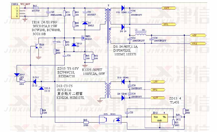 到此雖然檢修過程結(jié)束,但工作并未完成:此電源板電路是LG IS5 系列幾千瓦到幾十千瓦變頻器的通用CPU 電源板,故繪出此電路圖并標(biāo)注出某些元件的參數(shù)及代換型號。當(dāng)以后遇到同樣的機器時,在找不到原型號可找代換的,如果連代換的也找不到的話就以能購置到且性能最相近的元器件裝機。更重要的是,不再怕被別人修過的同型號“轉(zhuǎn)修機”,即我們行內(nèi)常說的“同行機”——丟失或是換錯元器件的機子。