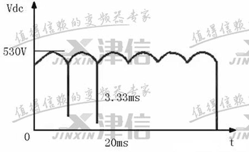 ???當變頻器正常工作時,Udc上的電壓如下圖所示,一個工頻周期內將有6個波頭,此時直流電壓Udc將不會低于470V,對于一個7.5kW的變頻器而言,其C的值大小一般為900uf,當滿載運行時,可以計算出周期性的電壓降落大致為40V,紋波系數不會超過7.5%。而當輸入缺相發生時,一個工頻周期中可能只有2個電壓波頭,且整流電壓最低值為零。此時在上述條件下,可以估算出電壓降落大致為150V,紋波系數要達到30%左右。