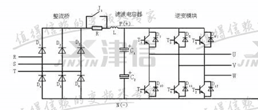 由此可以看出,在變頻器輸入缺相后仍在運行時,電容C將被反復大范圍的充電,這種情況很可能導致電容器損壞,而且當負載較重時,還會進一步損壞整流橋,如在送電時就發生缺相,由于單相大電流運行極易造成變頻器燒毀。