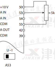 12、27短接,50、53、55接電位器,其中53為電位器中間抽頭,接線前確認控制卡上(面板拿下來右下角)53撥位開關是否在U端,設置參數3-15改為1、6-10端子53低電壓、6-11端子53高電壓、6-14 53參考反饋低、6-15 53參考反饋高。