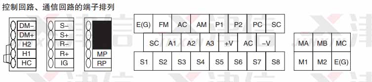 • 控制回路端子+V,-V電壓的輸出電流容量最大為20mA。請勿使控制回路端子+V,-V間短路。否則將會導致誤動作或故障。