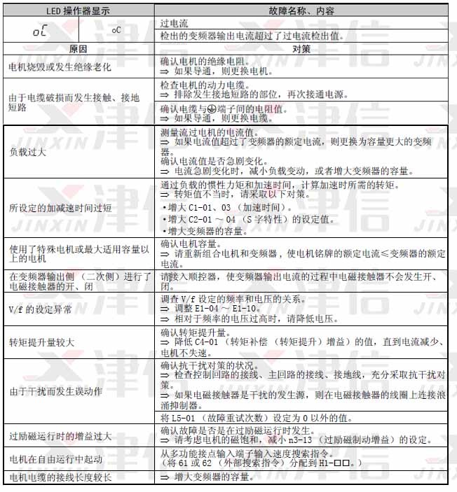 1. 自由運(yùn)行中或急減速后,電機(jī)中還殘留有感應(yīng)電壓又重啟運(yùn)行 2. 變頻器發(fā)生硬件故障 |