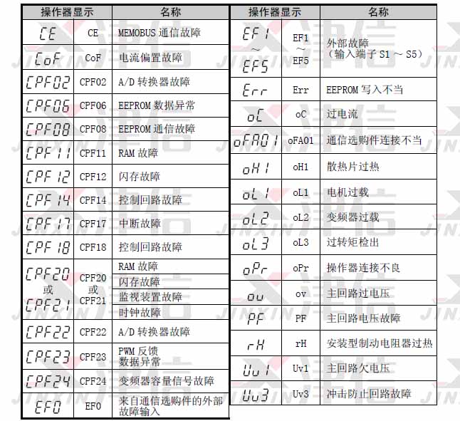 一、uoL,uUS,CE,CF,CoF,CPF00、CPF01,CPF20、CPF21,CPF02,CPF03,CPF06,CPF07,CPF08,CPF11,CPF12,CPF13,CPF14,CPF16,CPF17,CPF18,CPF19,CPF22,CPF23,CPF24,CPF26 ~ CPF34,CPF40 ~ CPF45,dEv,dv1,dv2,dv3,dv4,dv7,dWAL,dWFL故障代碼